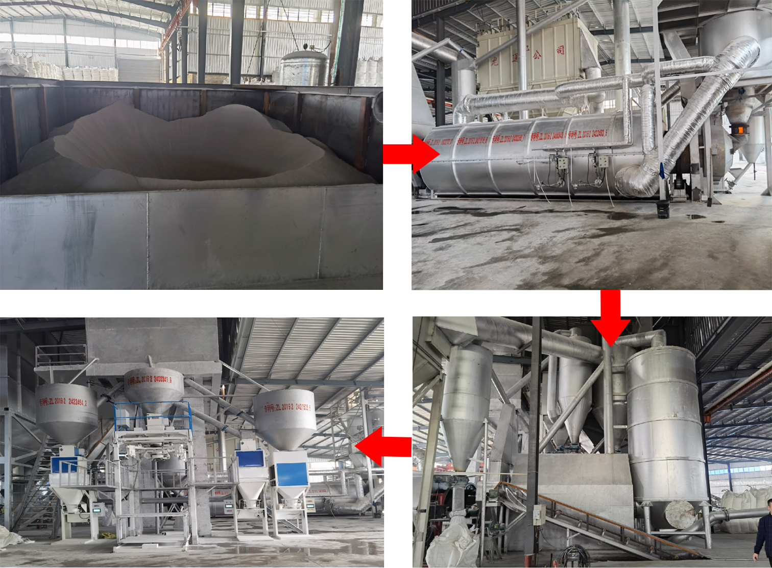 一次性可投放100T原材料,料倉側壁有收風口收塵,物料經過輸送帶輸送至預熱爐中,預熱爐為雙層滾筒,大筒與小筒互套在一起,物料直接進入到內筒中,通過烘干、預熱、脫水處理,處理結束后經提升機提升至膨化爐中對物料進行膨化,主爐膨化后的產品柔性回流至預熱爐中心筒經過余熱回收管理系統收集余熱后,進入金輝專利技術懸浮法五級風選(把未完全閉孔的產品分類收集),風選過后的產品進入成品倉通過輸送機提升至柔性篩分系統(把未完全膨化的燒結砂篩除掉),最終經過級配管道流入定量包裝系統進行包裝,以上程序可以保證松銤維鉑的閉孔率和漂浮率,金輝公司宗旨是以高品質產品服務于市場。
